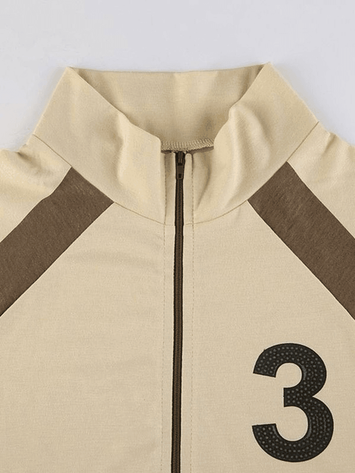Description: Shaped to a fitted silhouette. these crop tops featured number pattern at chest. with contrast paneled and short tank sleeves design. complete with zip fasten at front.