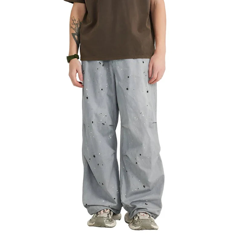 Washed Splashed Wide Leg Cargo Pants. crafted from cotton in a broadcloth fabric for durability and comfort. These midweight. full-length pants feature a wide-leg style with pleated front and mid waist for a relaxed fit. Adorned with unique appliques and secured with a drawstring closure. they offer a blend of practicality and edgy style. Perfect for a versatile. statement-making addition to your wardrobe.