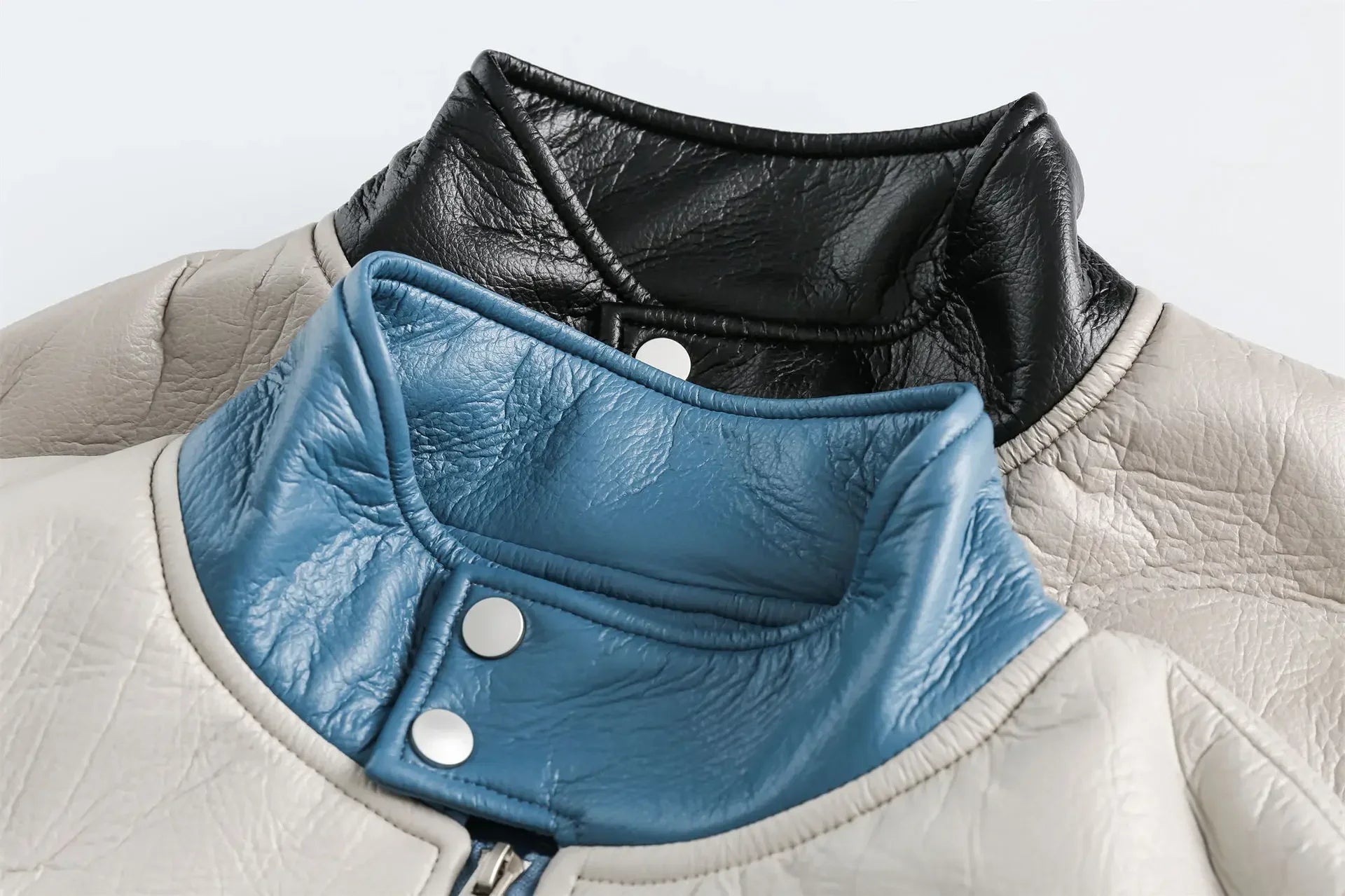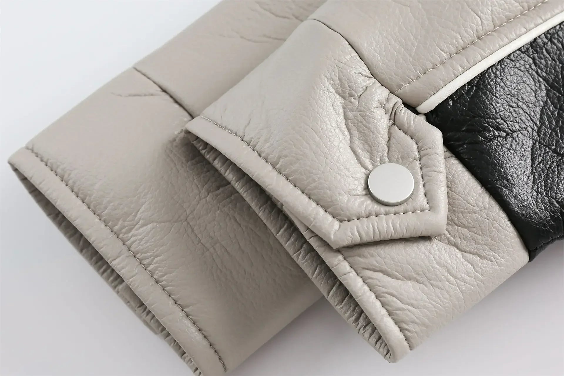 Exquisite detailing is crafted into the fabric of our Waterproof Leather Jacket. with a polyester composition that lends structure while a stand collar makes a bold statement. The standard thickness and patchwork pattern then elevate the look with a subtle opulence.