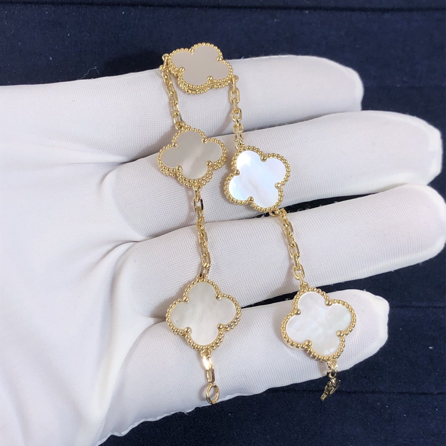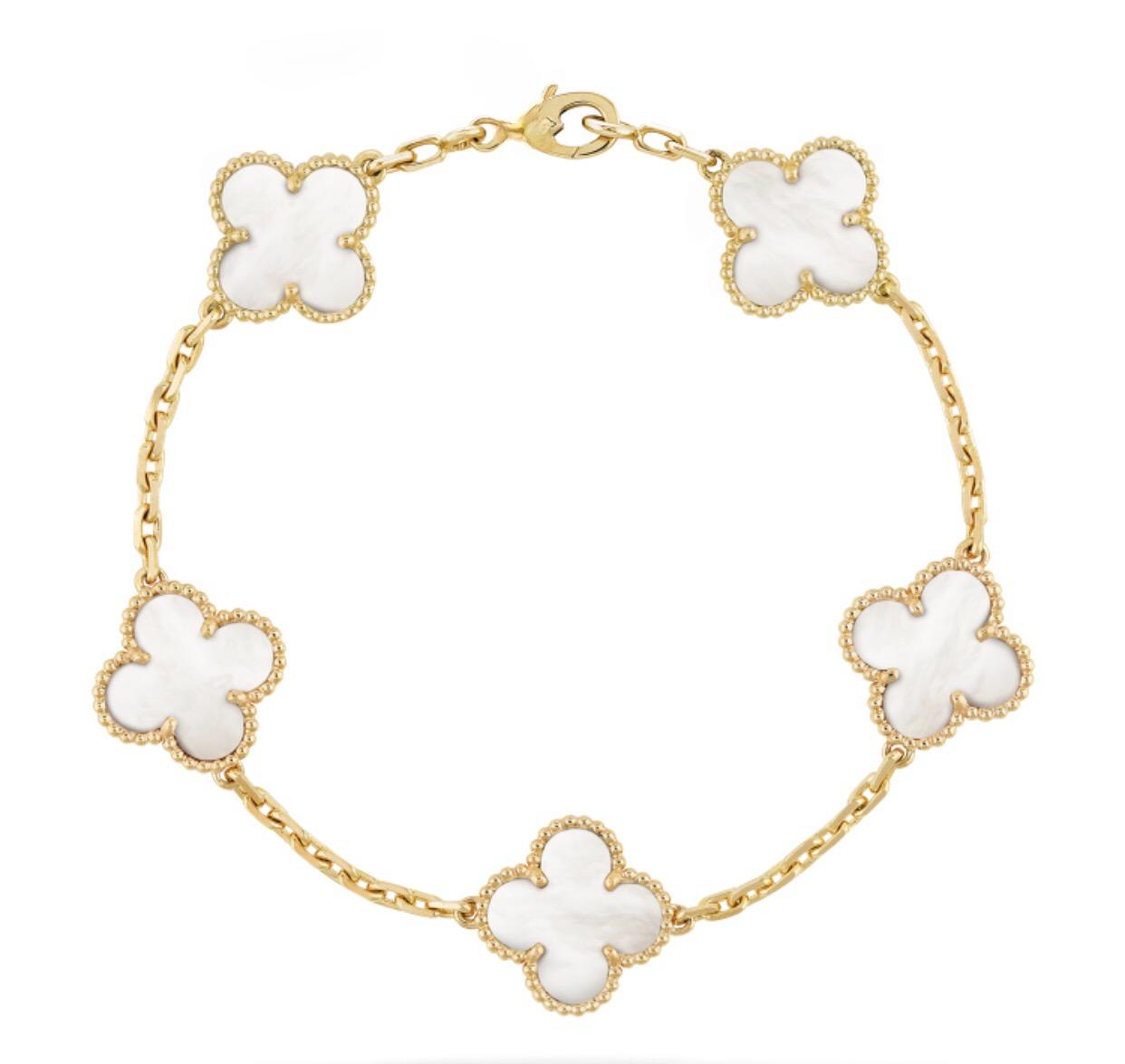 The White & Gold 5 Motif Clover Bracelet embodies timeless elegance with its classic. clover-shaped motif.