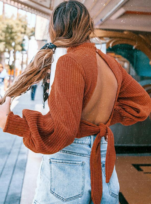Necbe - Women Openwork Knitted Tight Lantern Sleeve Bare Back Sweater