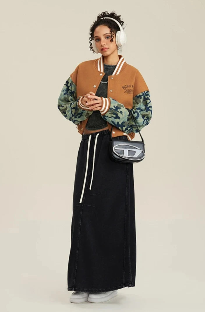 The Women's Camouflage Varsity Jacket combines sporty vibes with a bold. camo twist. Featuring classic varsity details and an eye-catching camouflage pattern. this jacket adds a trendy. edgy look to any outfit. perfect for those who want to blend street style with standout flair.