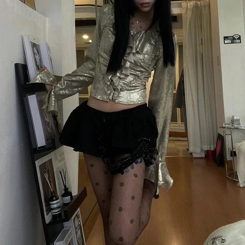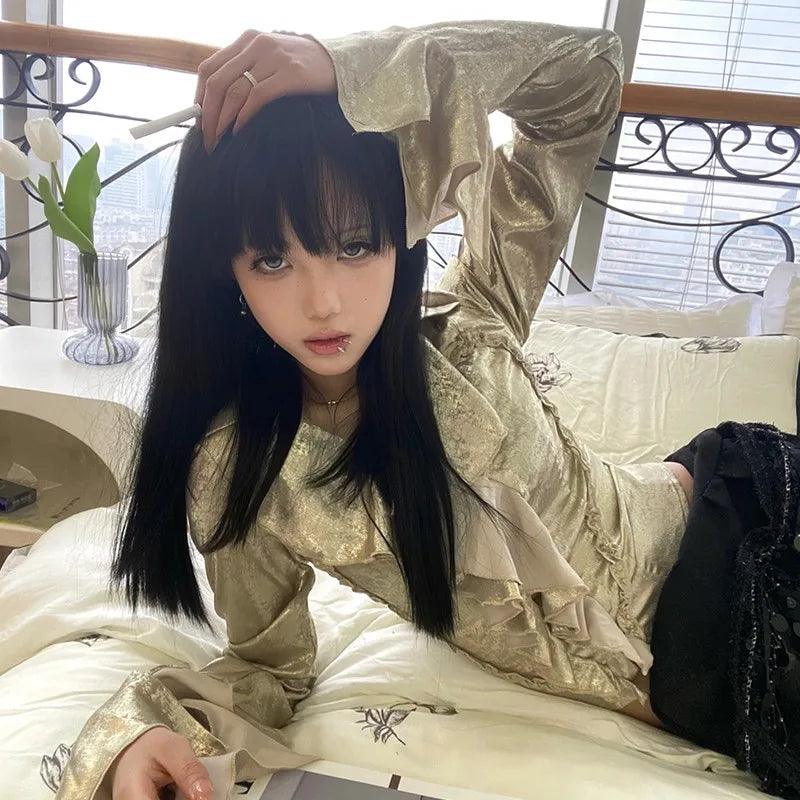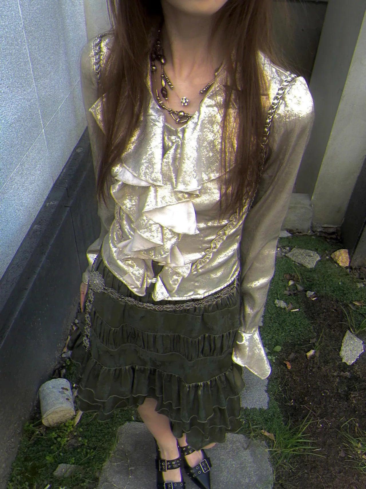 Step into the Y2K aesthetic with Vonvex's Ruffles Gold Shirt. Crafted from a blended fabric of cotton and acetate. it offers comfortable yet stylish wear. Featuring a solid pattern and regular fit. it's perfect for any occasion. The slight stretch ensures flexibility. while the standard thickness provides warmth without bulk. Adorned with charming ruffles and a flattering V-neck collar. it adds a touch of elegance to your ensemble. With a single-breasted closure. it's easy to wear and style. Whether you're pairing it with jeans for a casual outing or dressing it up with a skirt for a night out. this shirt is sure to make a statement.