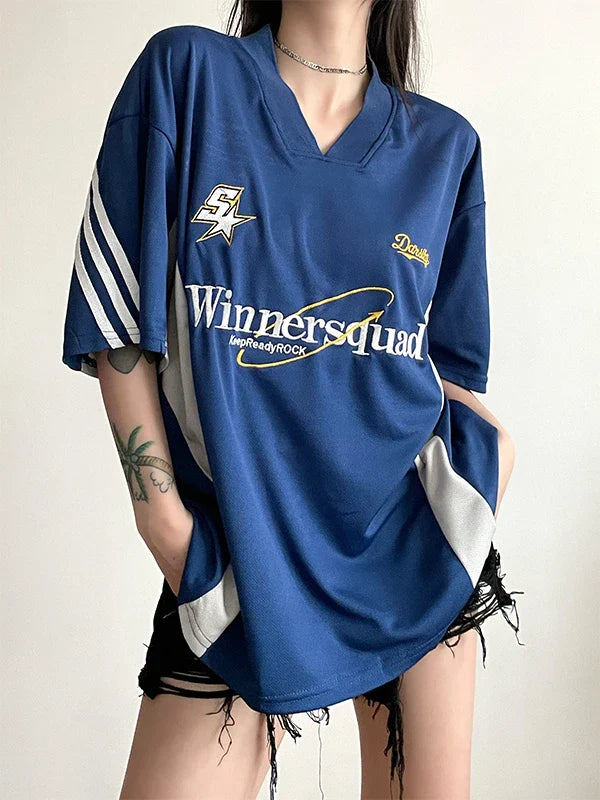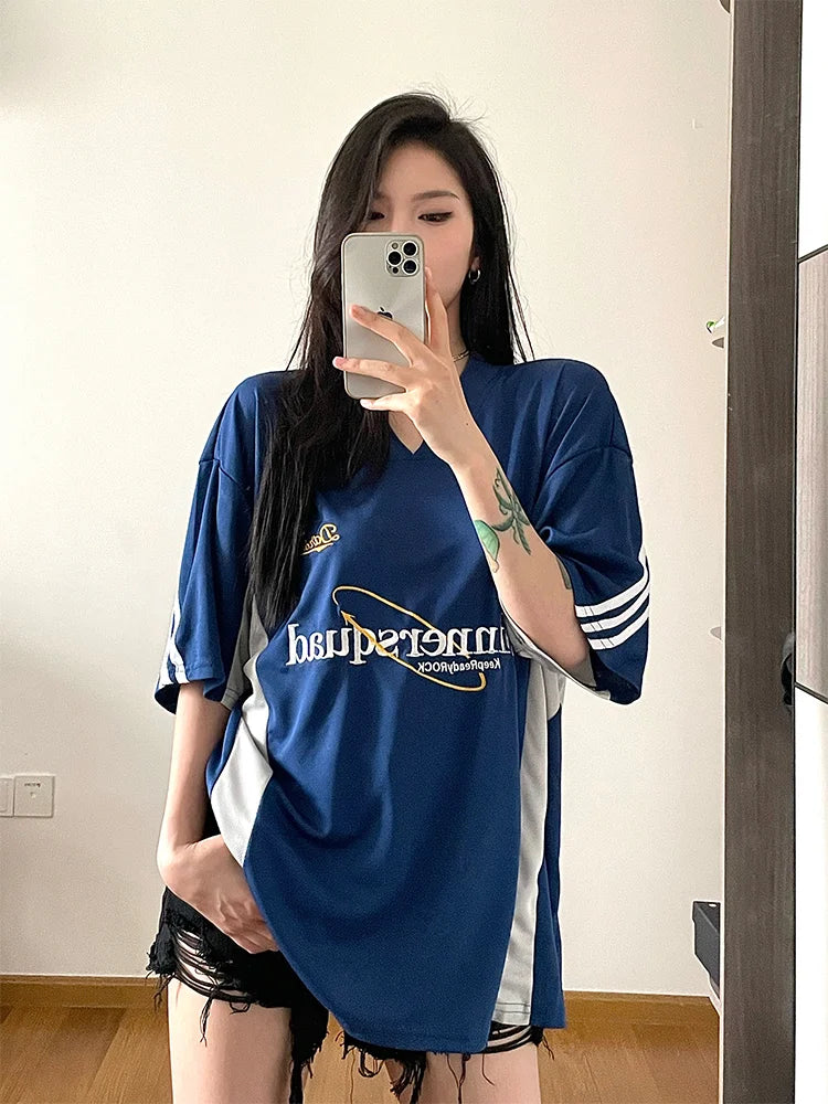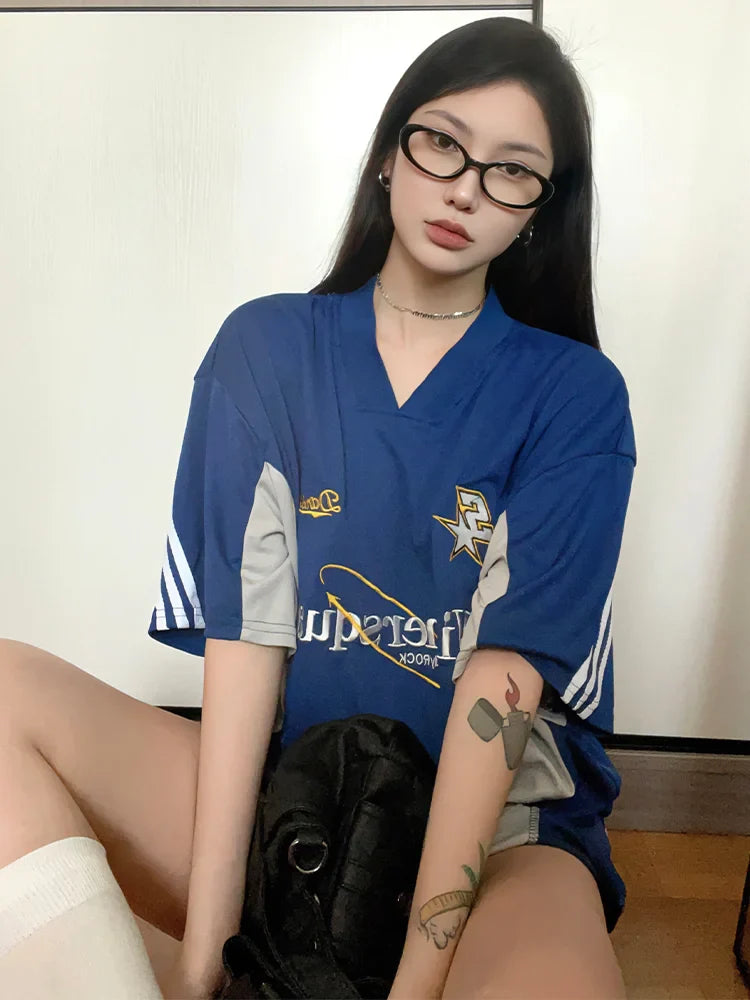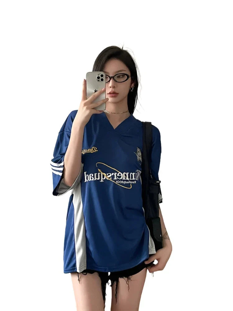 The Y2K Basketball Women's Oversized T-Shirt features a non-stretch. polyester broadcloth fabric with a letter pattern. It has a V-neck collar. loose fit. and is designed for comfort and style. featuring a unique "paragraph for vonvex brand" detail.