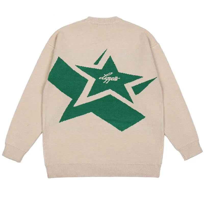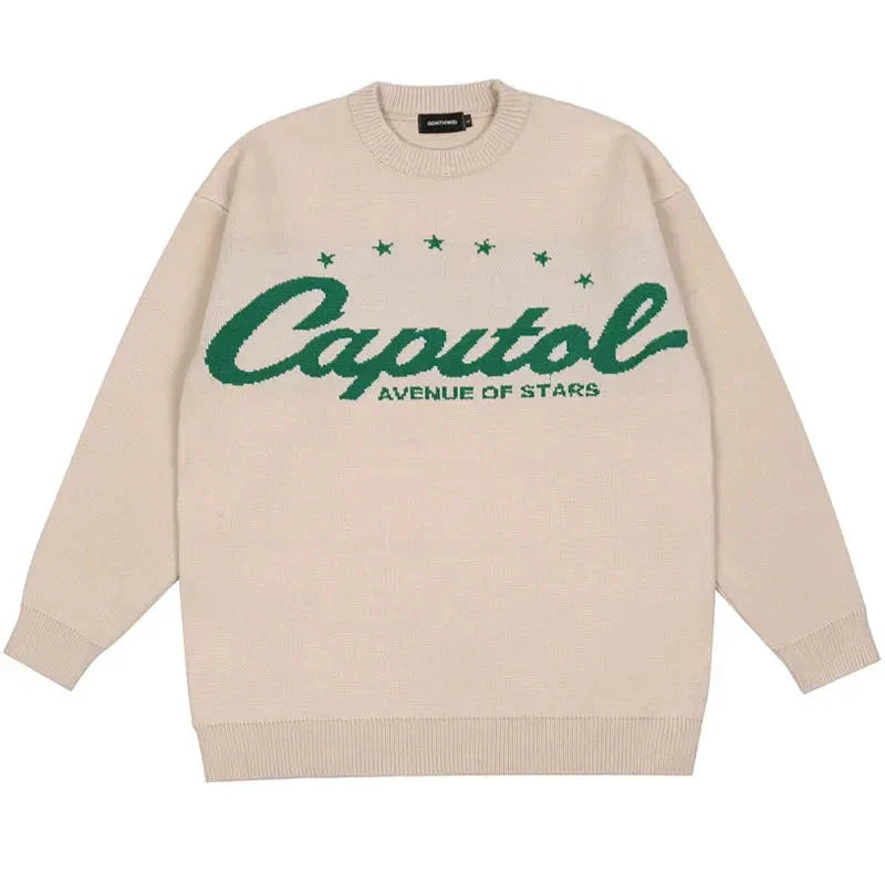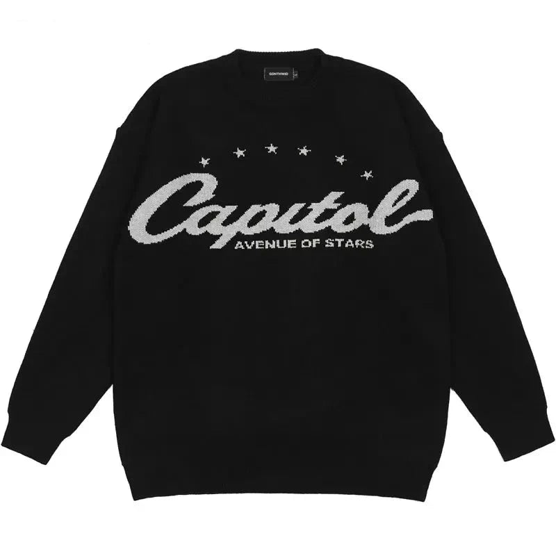 The Y2K Capitol Star Sweater combines retro charm with bold star patterns. perfect for adding a statement look to your streetwear style.