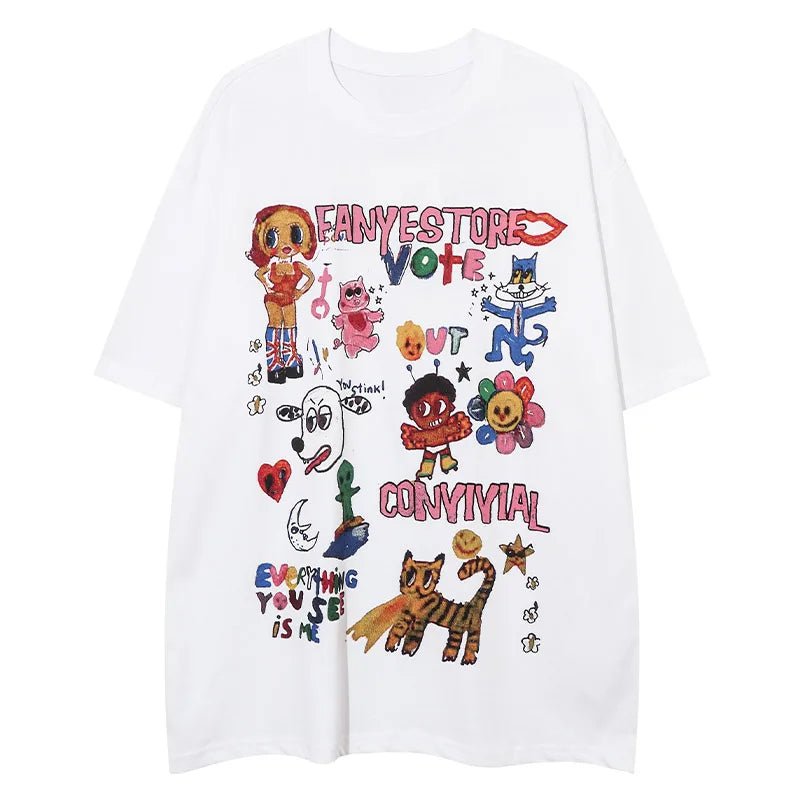 Discover Vonvex's Y2K Cartoon Graphic Printed T-Shirt. Crafted from cotton broadcloth. featuring an O-neck collar and vibrant cartoon graphics. Perfect for expressing playful style.