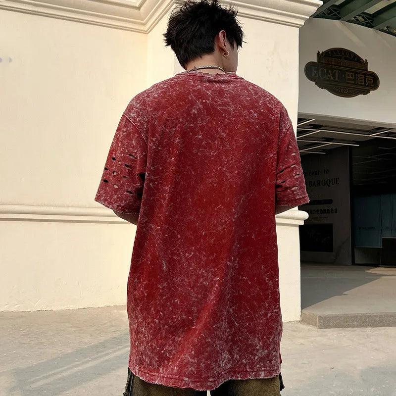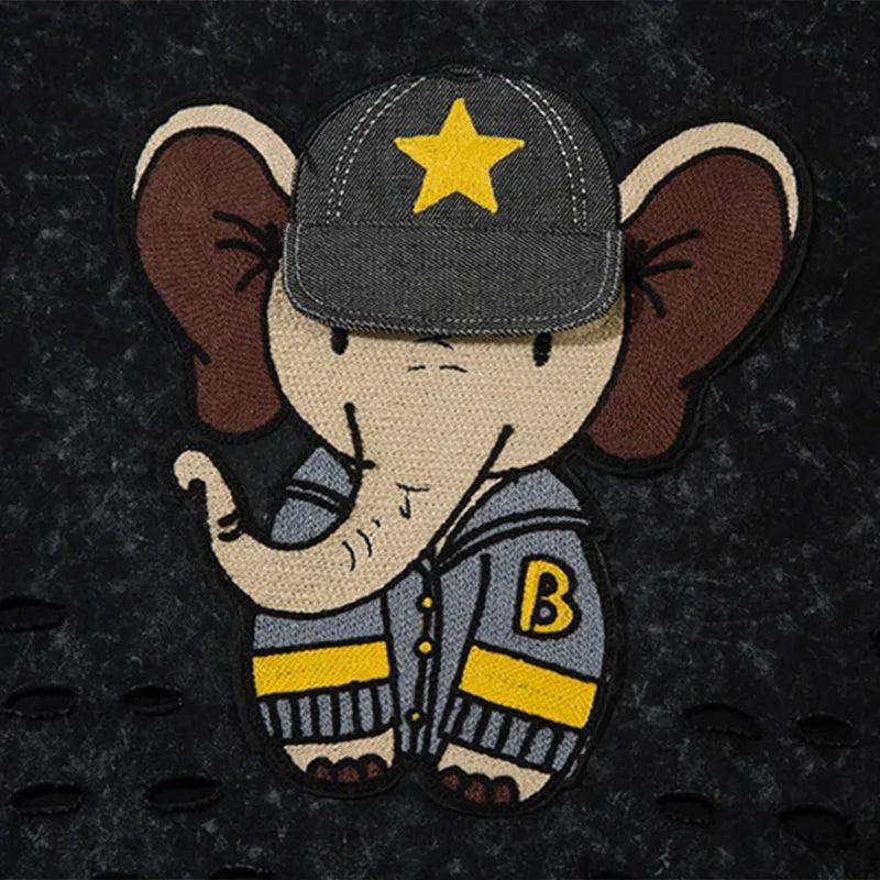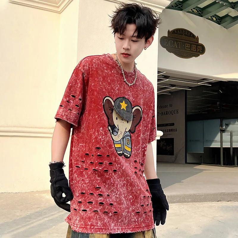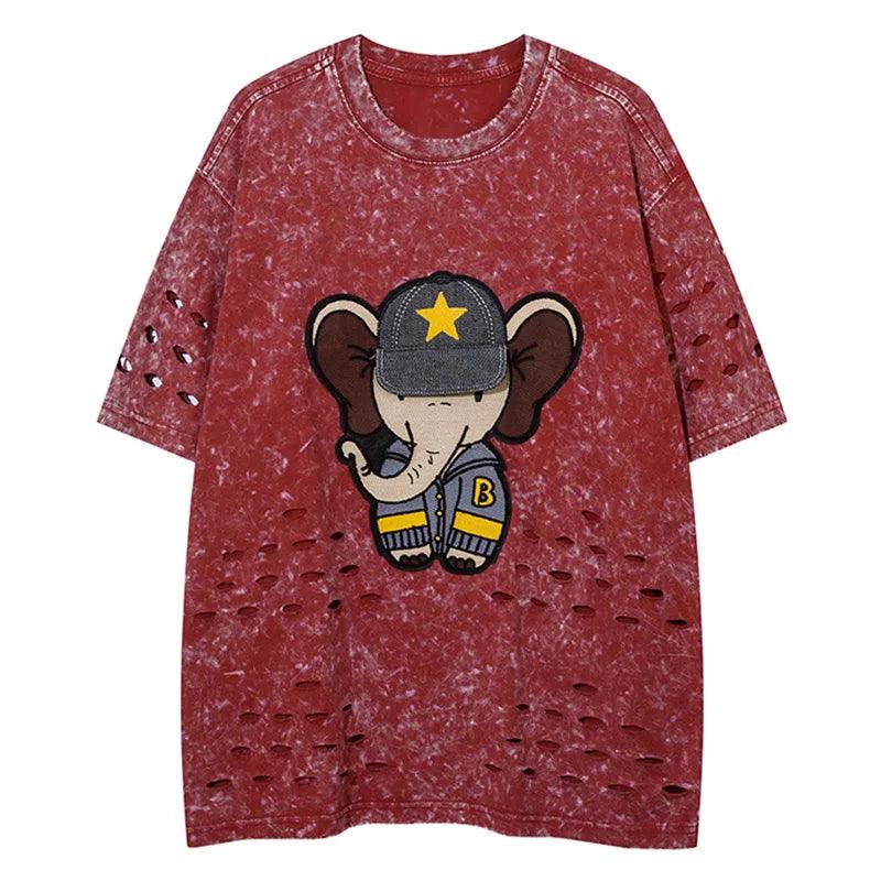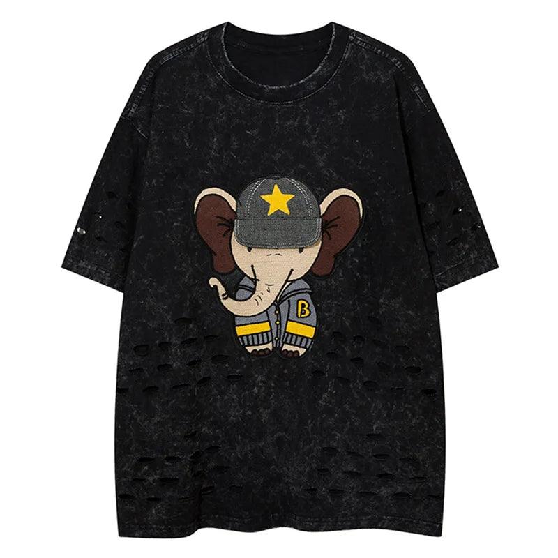 Y2K Elephant Patchwork Ripped T-Shirt: Vintage street style meets modern comfort. Polyester-cotton blend. O-neck. Broadcloth fabric. with cartoon patterns.