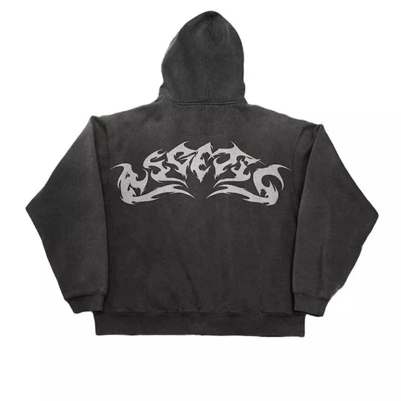 Get fiery style with our Y2K Flame Print Zipper Sweatshirt. Cotton. standard thickness. full sleeves. hooded collar. and bold letter pattern.
