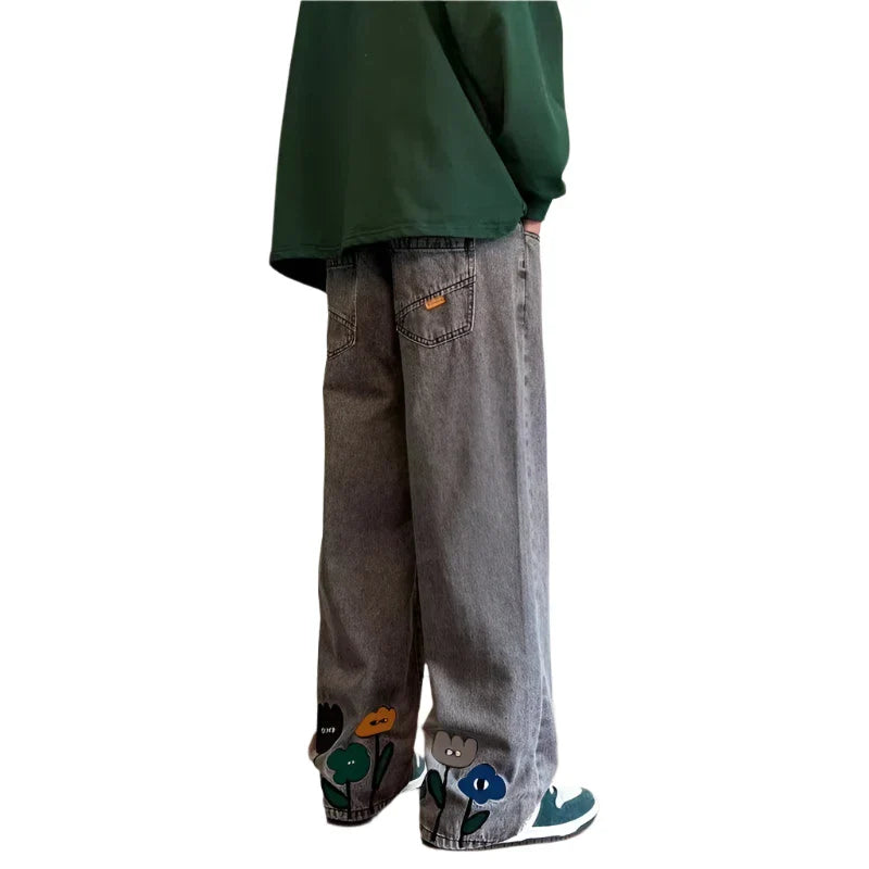 Elevate your vintage street style with our Y2K Flower Printed Baggy Jean. Soft denim. midweight. ombre pattern. and zipper fly closure for a retro vibe.