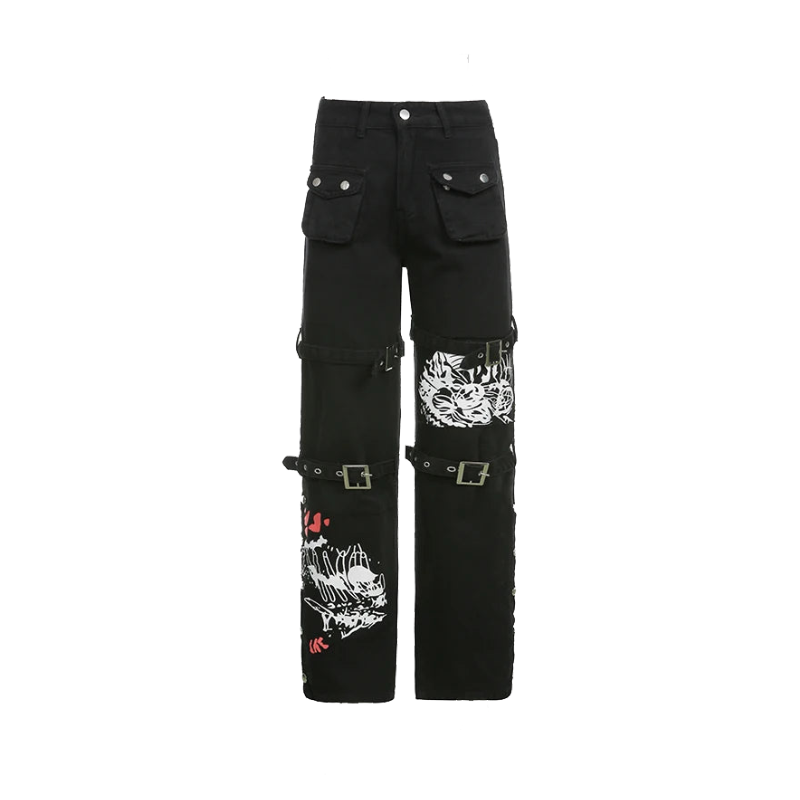 The Y2K Gothic Black Cargo Pants combine edgy Y2K aesthetics with gothic flair. Featuring a sleek black design with multiple pockets. these cargo pants are perfect for those who want a functional yet bold streetwear look.