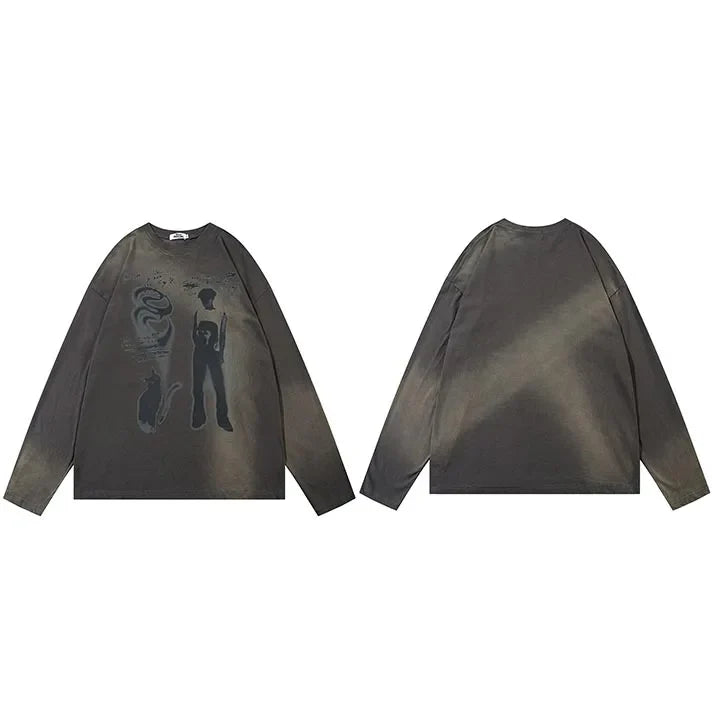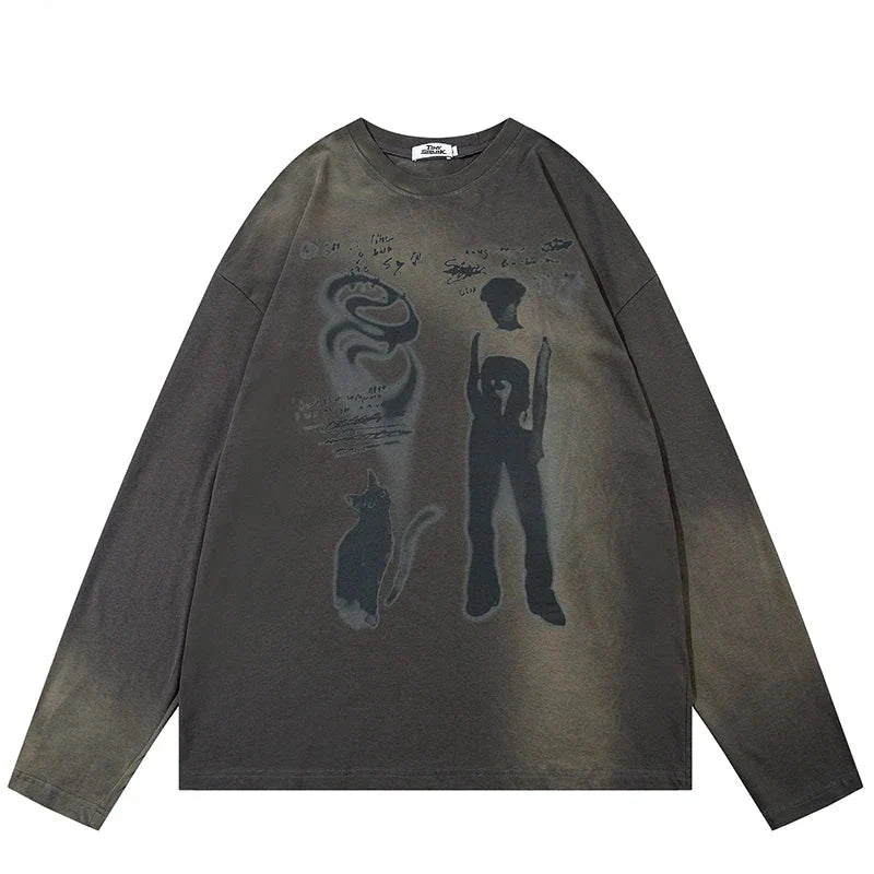 Y2K Graffiti Shadow Boy Sweater features bold graffiti-inspired graphics with shadowy accents. bringing edgy Y2K vibes to your streetwear style.