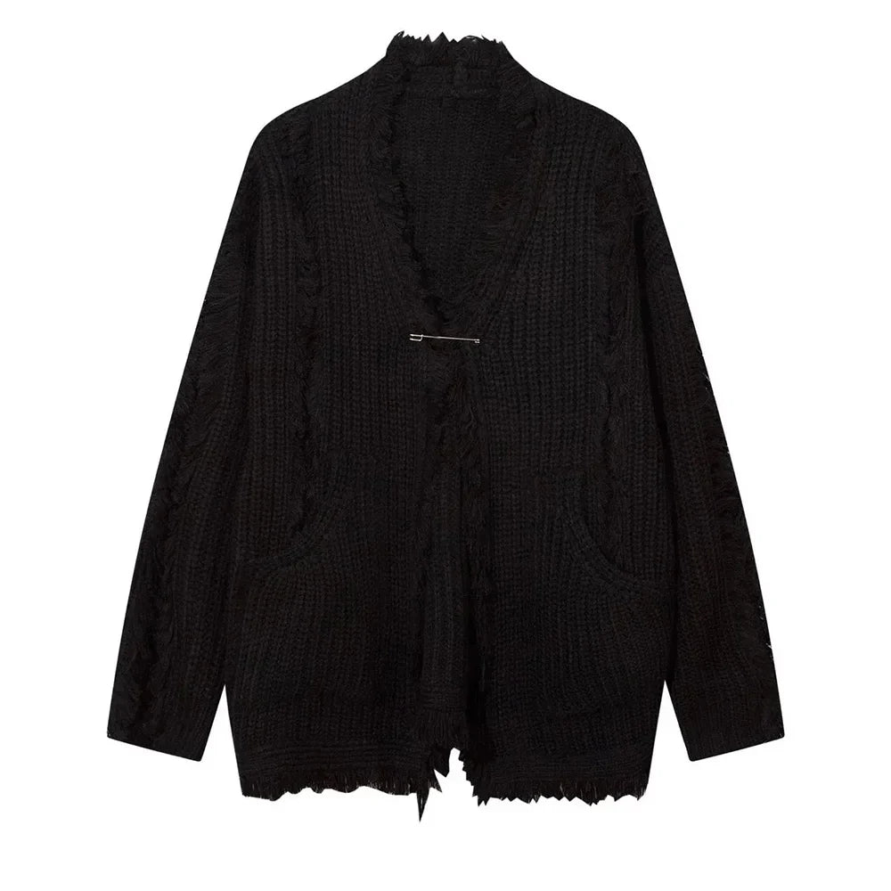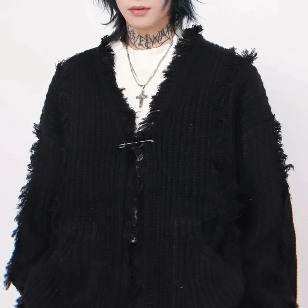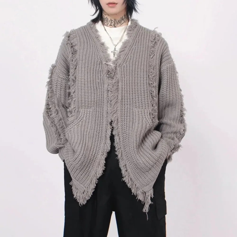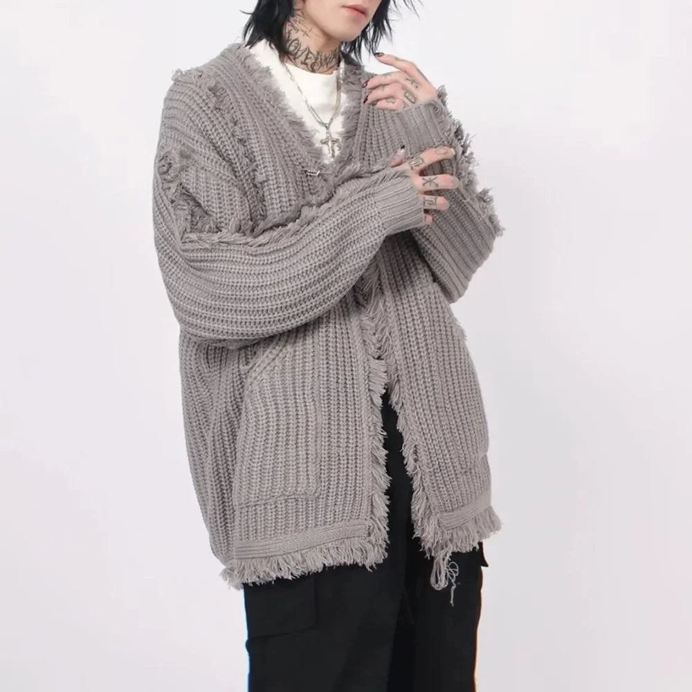 Y2K Irregular Tassel Knitted Cardigan: Edgy and cozy. featuring an asymmetrical design with playful tassels for a bold Y2K-inspired look. Perfect for layering.