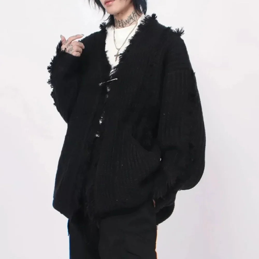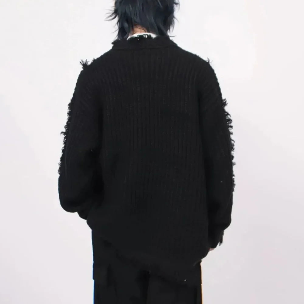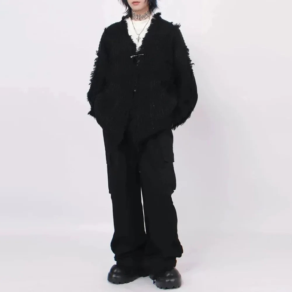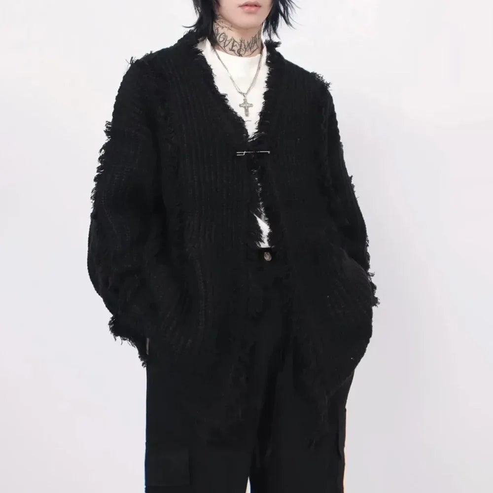 Y2K Irregular Tassel Knitted Cardigan: Edgy and cozy. featuring an asymmetrical design with playful tassels for a bold Y2K-inspired look. Perfect for layering.