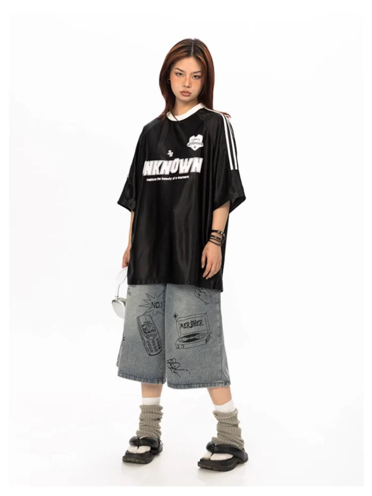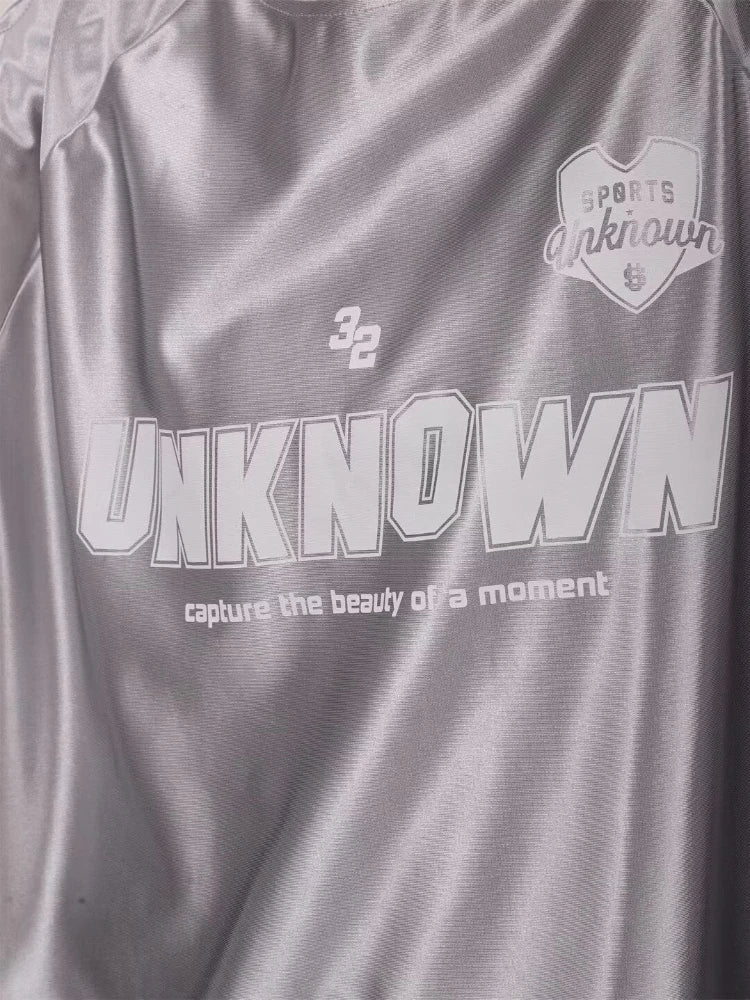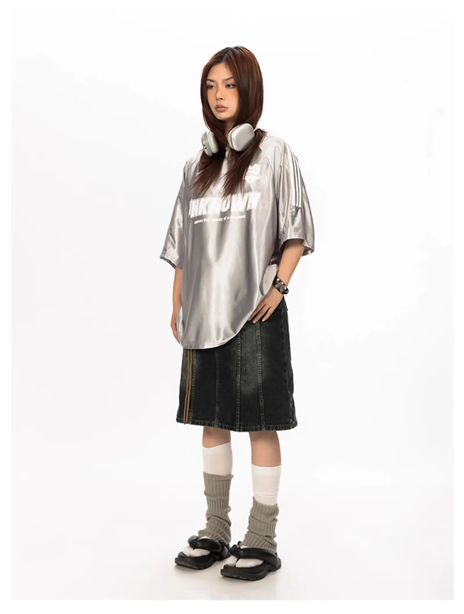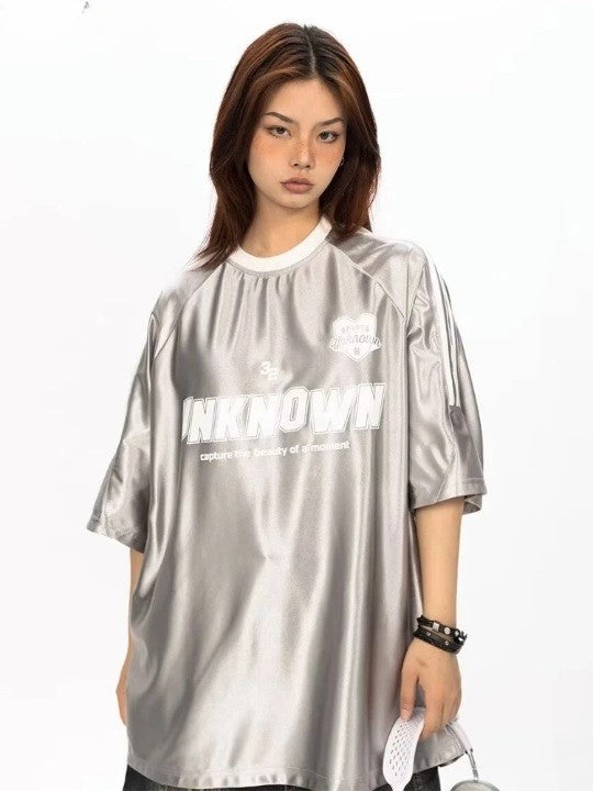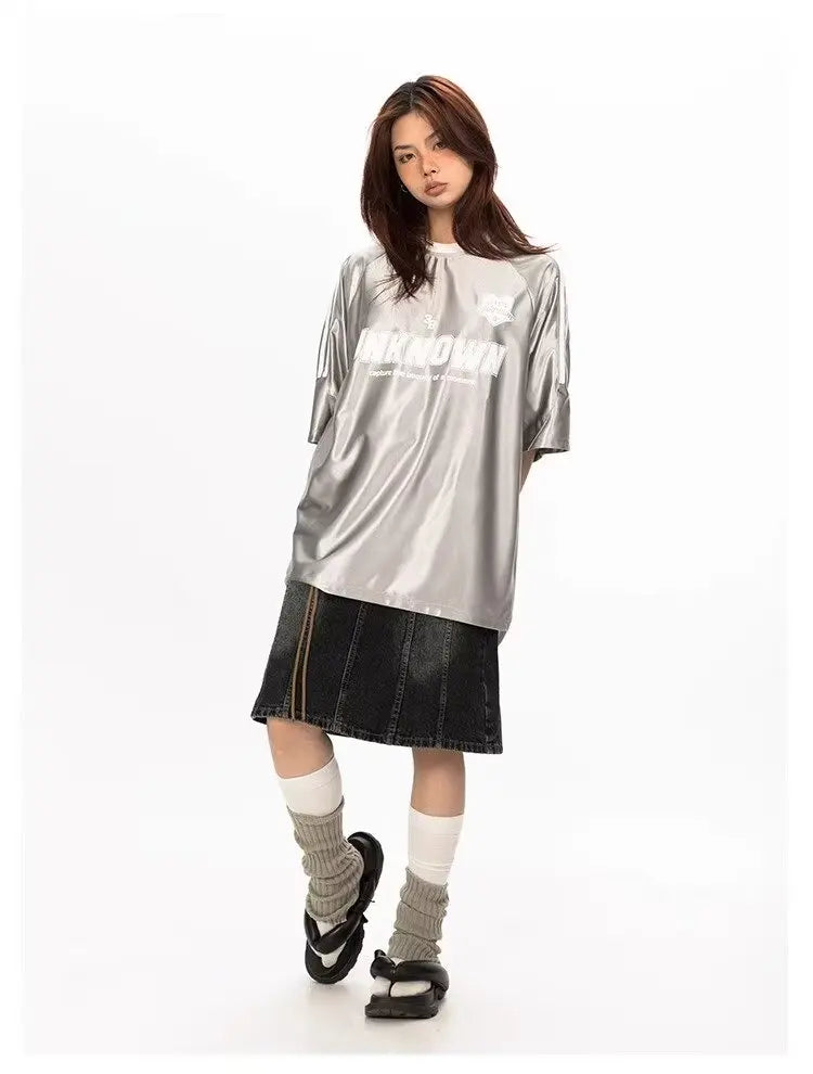Introducing Vonvex's Y2K Metallic Silver Oversized T-Shirt. crafted from cotton for ultimate comfort. Featuring an O-neck collar and regular sleeves. this broadcloth fabric T-shirt showcases a unique patchwork pattern. The TAT weaving technique adds a touch of futuristic flair to this standout piece. perfect for making a bold fashion statement.