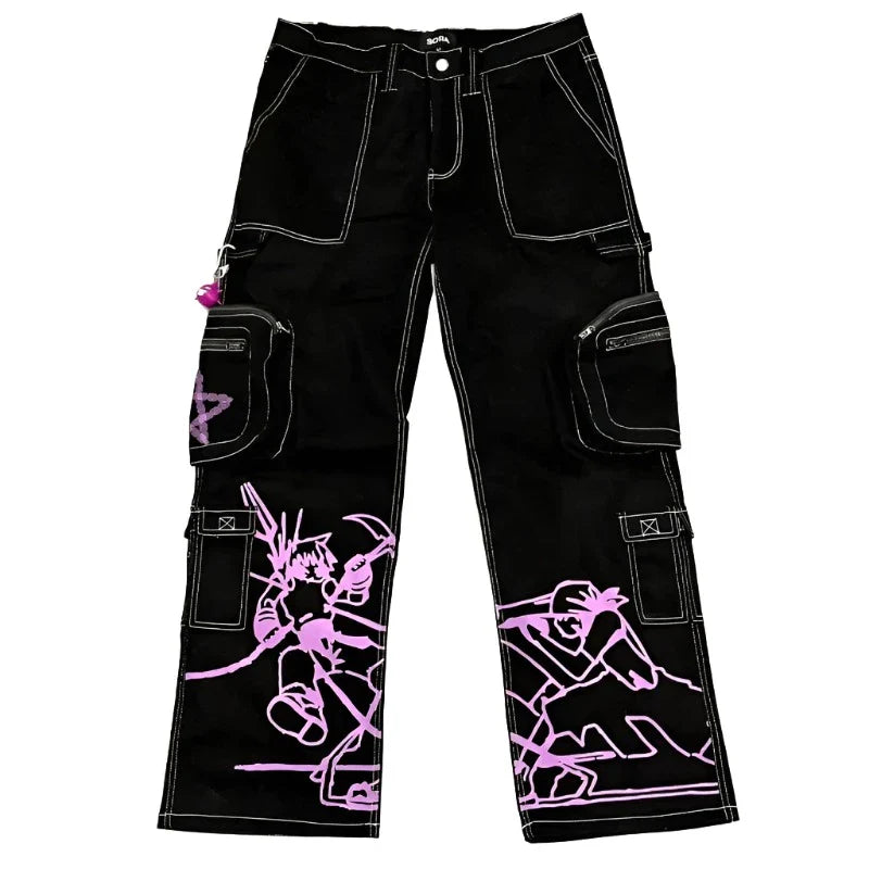 Introducing Vonvex's Y2K Printed Cargo Jeans. Crafted from polyester and cotton blend. it offers slight stretch and regular thickness. Featuring appliques and embroidery. with a wide-leg style and mid waist. it combines comfort and style. Perfect for a trendy and relaxed look.