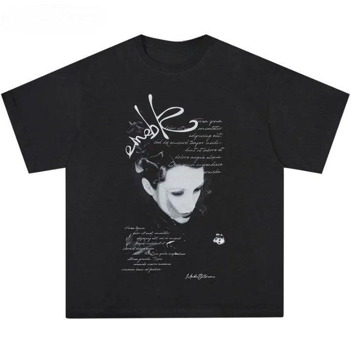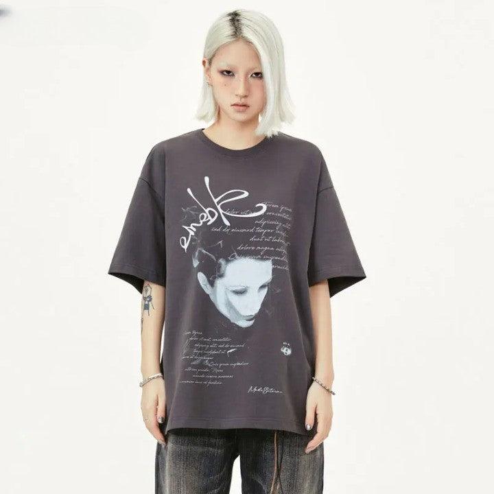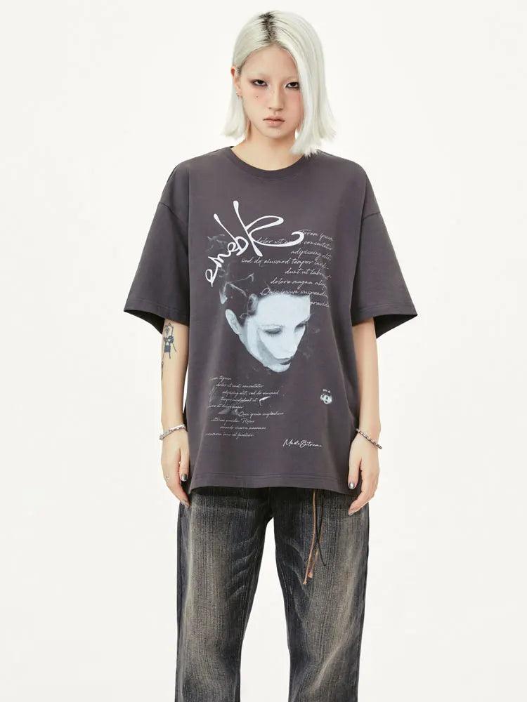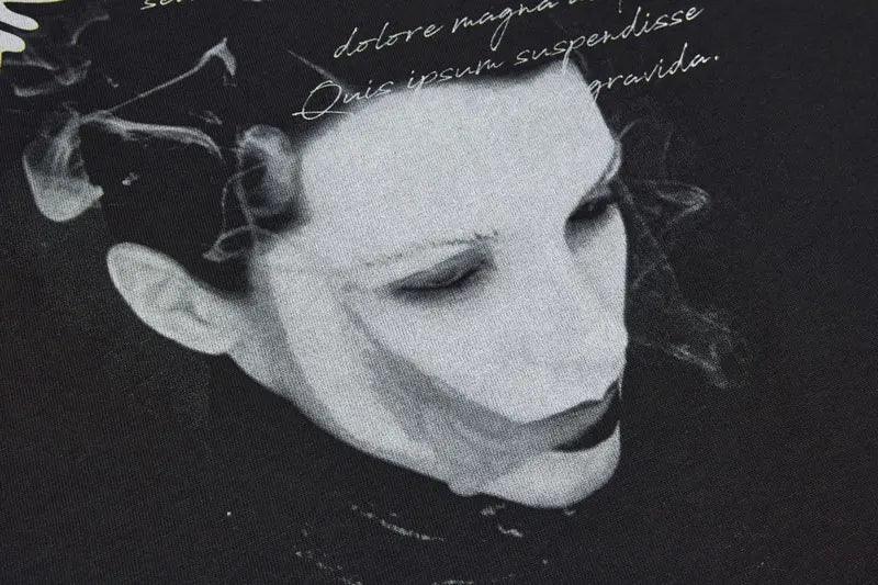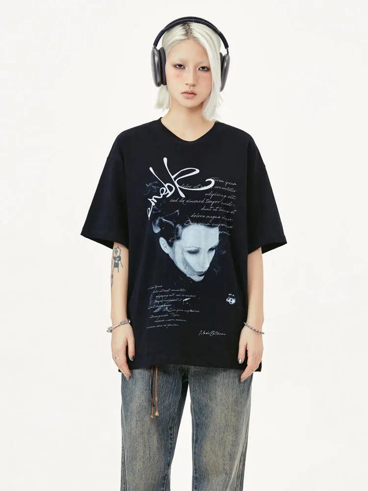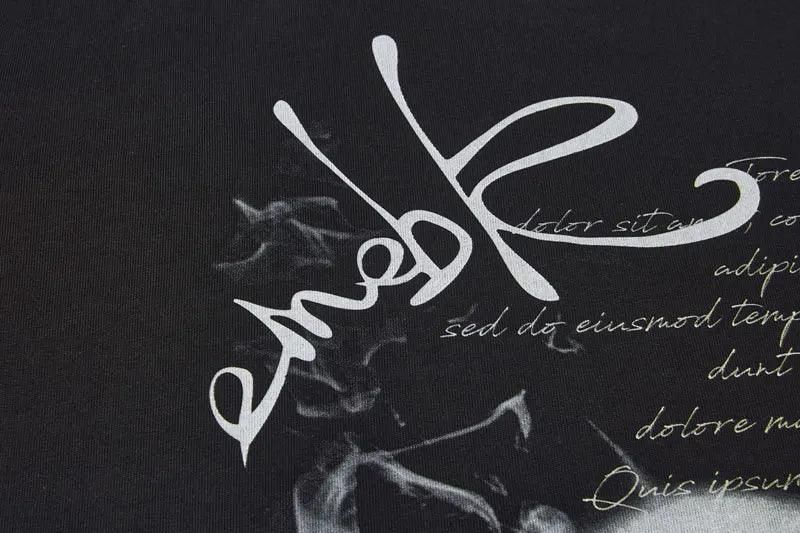 Indulge in street style with our Y2K Retro "SMOKE TEE" T-Shirt. Polyester. V-neck. broadcloth fabric. and eye-catching patchwork print design.