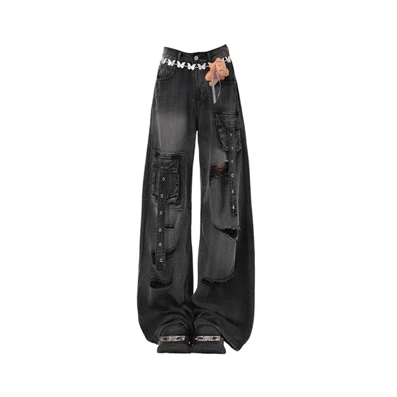 Embrace bold style with our Y2K Ripped Gothic Cargo Jeans at Vonvex Clothing. High-waisted. wide-leg. painted. and ripped for a unique vintage look!