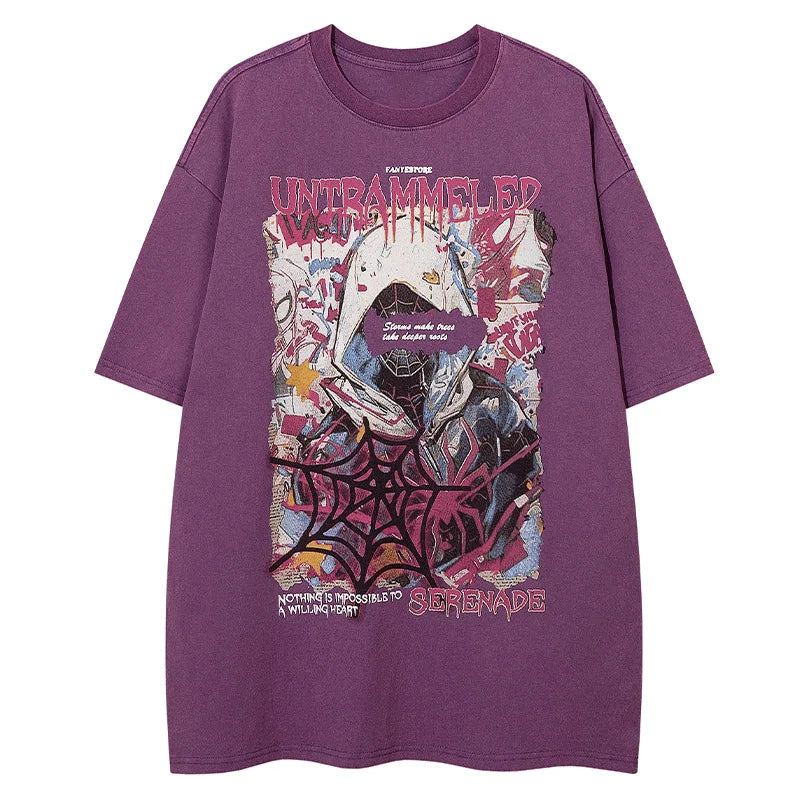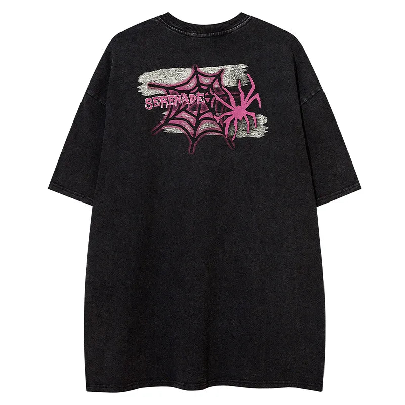 Discover Vonvex's Y2K Spider Letter Printed T-Shirt. Crafted from cotton broadcloth with an O-neck collar and dynamic cartoon pattern. Perfect for trendy. casual outfits.