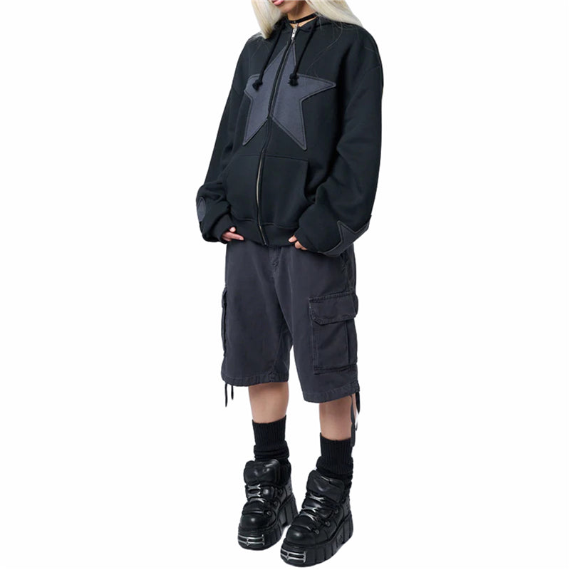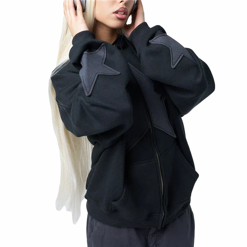 The Y2K Star-Patch Zip-Up Hoodie features bold star patches and a retro-inspired design. bringing back early 2000s vibes. Perfect for a cozy yet stylish streetwear look.
