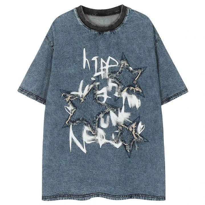 Step into the Y2K era with our street-style combo: Star Splicing Letter Printed T-Shirt paired with Flower Printed Baggy Jean. Vintage cotton. patchwork patterns. O-neck collar.